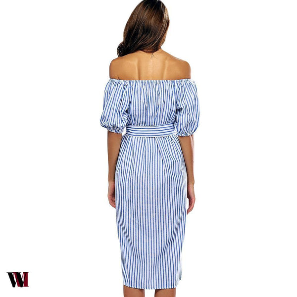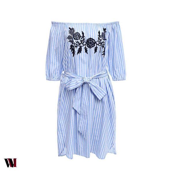 Freshen up your wardrobe with this lovely stripe dress. This trendy dress features off-the-shoulder neckline, short sleeves, blue striped pattern and floral embroidery. There are pockets at side and the waist tie shows off an A-line silhouette.